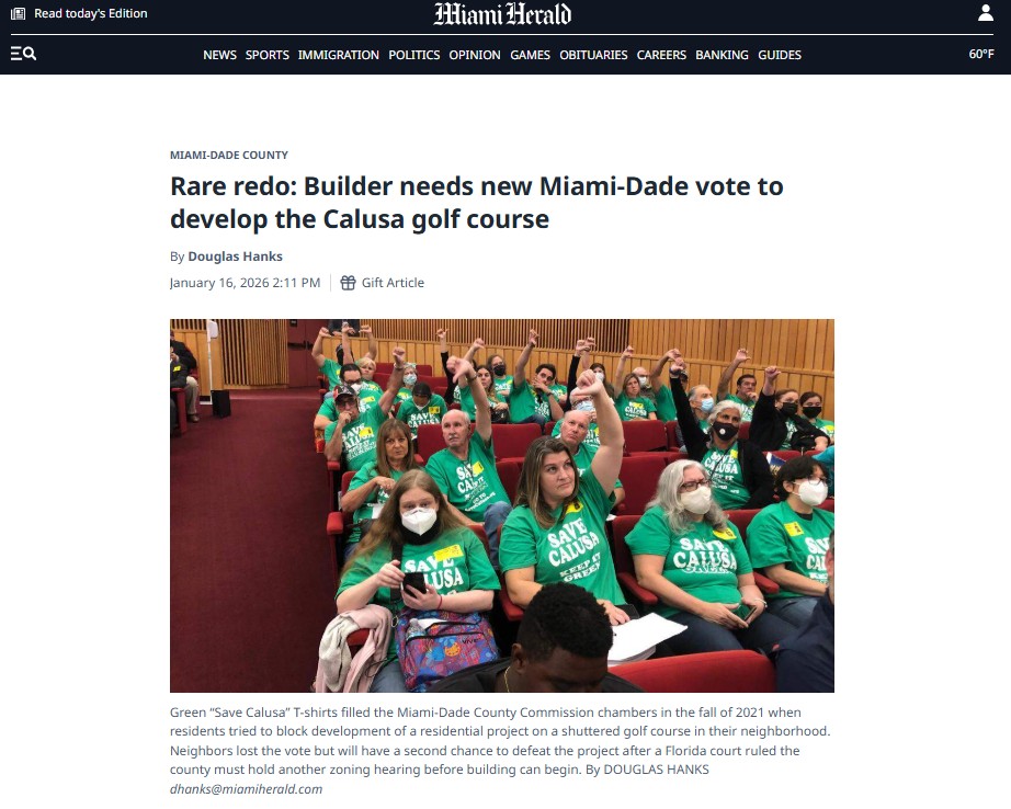January 2026 Miami Herald Rare Redo: Builder needs new Miami-Dade vote to develop the Calusa golf course